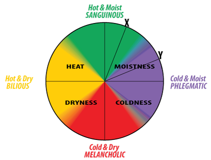 Adjacent is an example of an individual with a dominant sanguinous sub-dominant phlegmatic temperament as indicated with the line marked X. In this example this person has an overall dominant quality of moistness less heat, followed by coldness and the least amount of dryness. Similarly, an individual with dominant phlegmatic, sub-dominant sanguinous temperament (marked with a Y) will also have an overall quality of moistness but followed with coldness than heat and also the least amount of dryness. However, both temperamental combinations have a dominant quality of moistness and the least amount of the dryness quality.