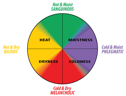 The adjacent chart reflects that the Sanguinous temperament, with qualities of Hot & Moist, is opposite to the Melancholic temperament with qualities of Cold & Dry. Likewise, the Phlegmatic temperament, Cold & Moist is opposite to the Bilious temperament, Hot & Dry.